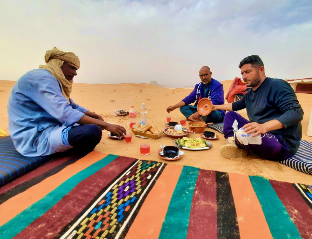 Nous dormons sous tente dans le désert. Les repas sont préparés à midi et au bivouac du soir par notre cuisinier.