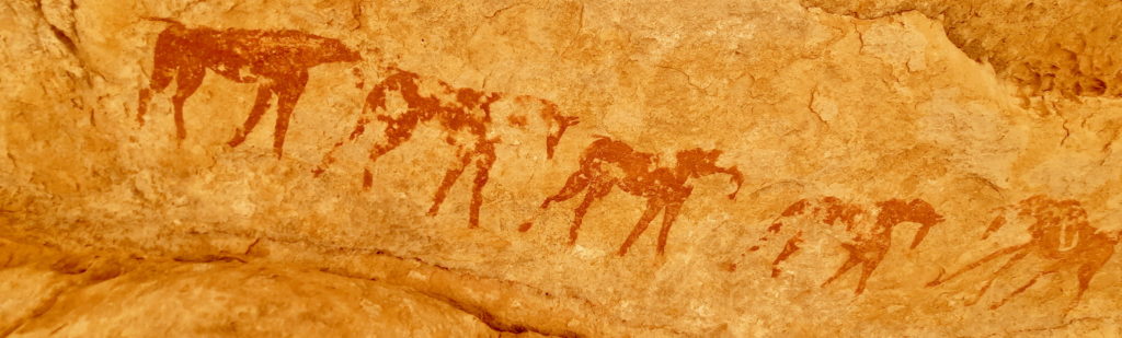 A l’époque où le Sahara était verdoyant et fertile, des populations de chasseurs et de pasteurs y vivaient : nombreux sont les dessins représentant des troupeaux de bovins menés par des bergers. Leurs œuvres d’art figurent des scènes de chasse , de danse et d’affrontements …