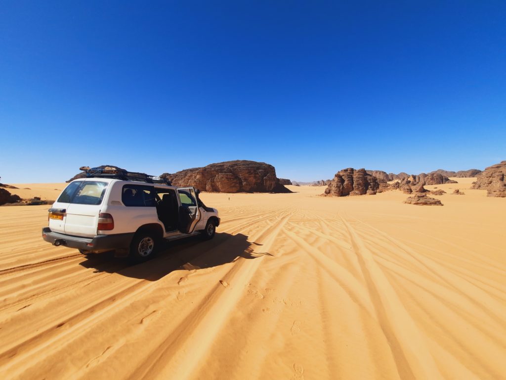 Ensuite, nous laissons nos guides chameliers et rentrons en 4×4 à Djanet. Une chambre d’hôtel nous y attend, avec une bonne douche.