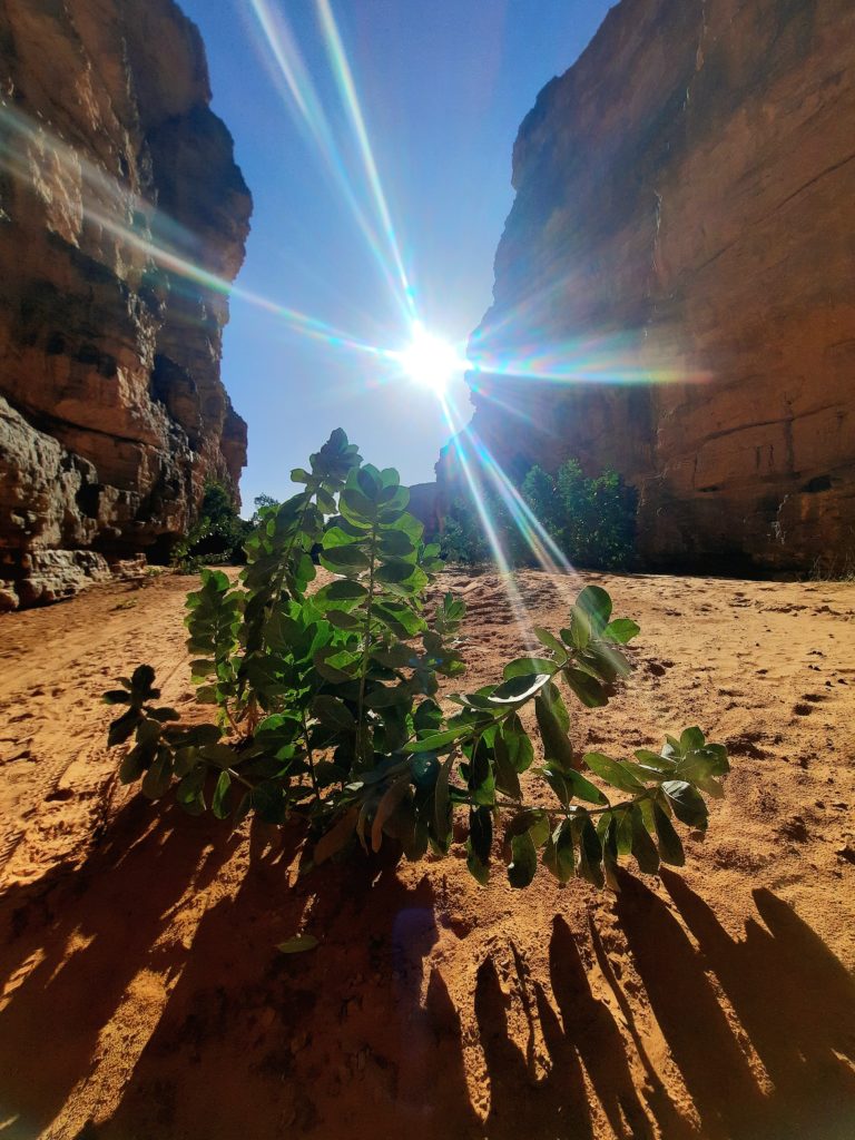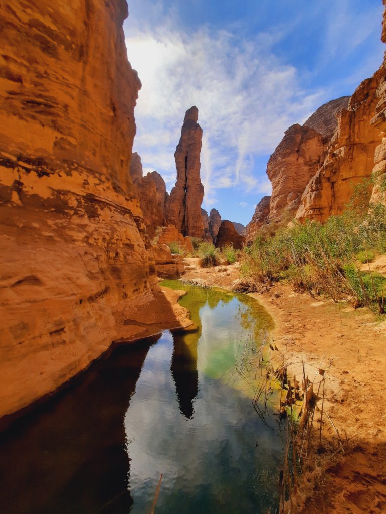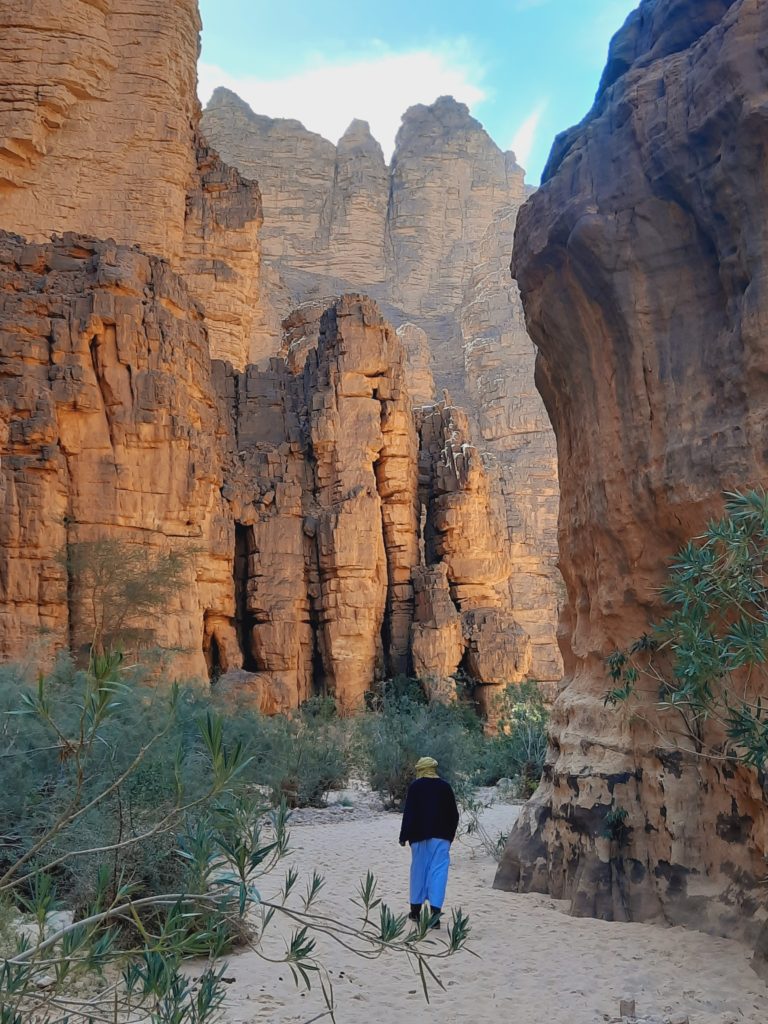 Au centre d’un grand oued, la végétation se fait de plus en plus présente. Puis de grandes falaises nous encerclent, donnant l’impression d’une barrière impénétrable.